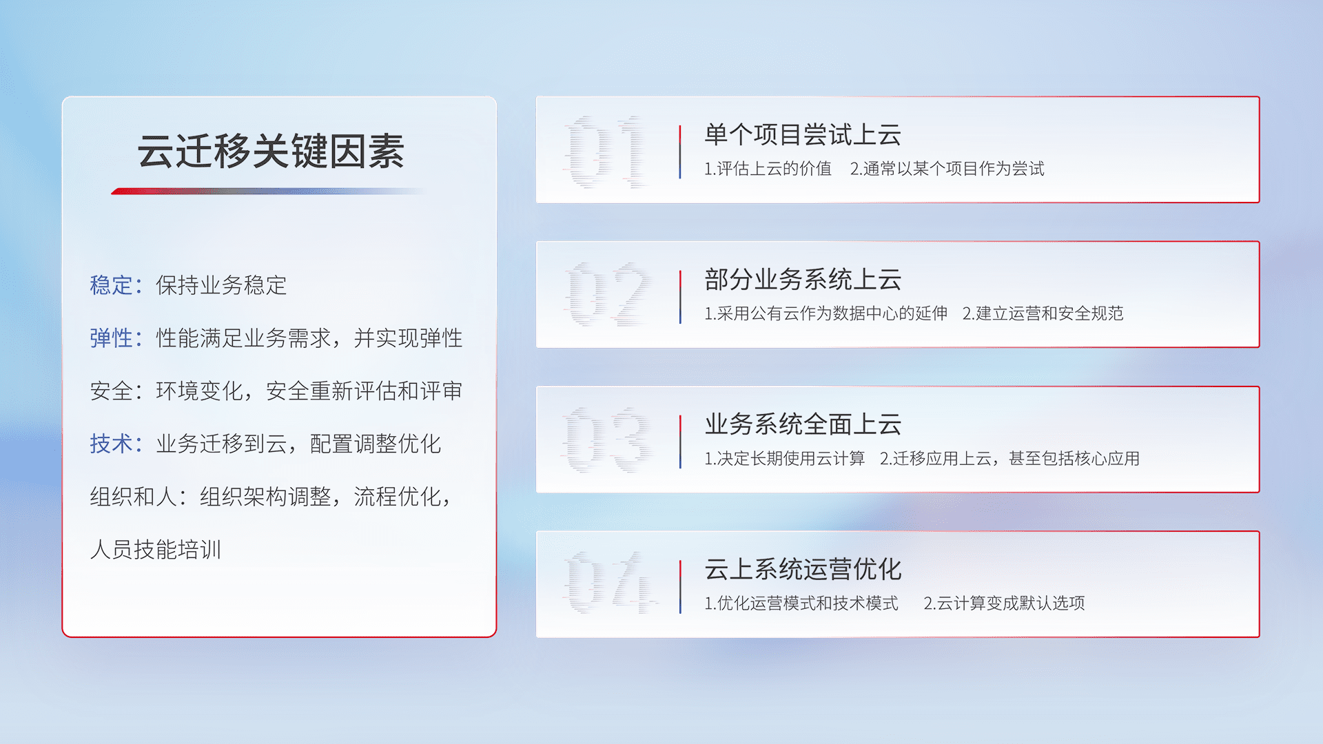 结合实际业务,,,从规划设计、、云平台选型、、云原生改造、、、、数据迁移、、、集成交付,,迁移全过程为客户识别最佳上云路径,,,,做好风险识别管理,,设计网络架构、、、身份权限、、、安全审计合规、、、、操作审计、、、、日志审计、、、、监控告警策略、、、多站点容灾设计等,,,对云上基础设施进行整体规划,,,,提升IT治理水平,,,,以满足弹性、、、高可用、、、、高性能的需求。。。。