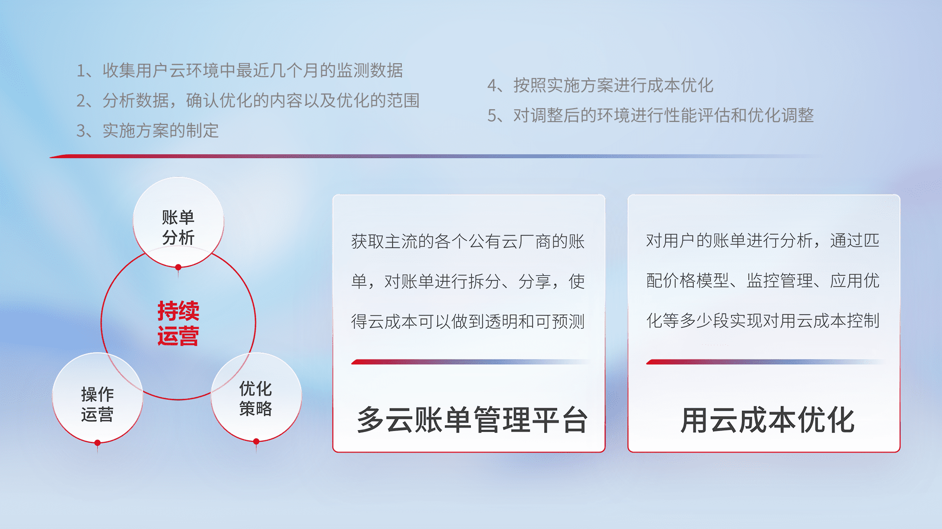 通过多云纳管,,,以统一的资源数据模型把客户的云资源进行抽象和封装,,,,进而实现对多云资源的统一操作,,,,保障云资源管理的可靠性、、、、稳定性与可用性。。。量身定制化运维内容,,,,配置、、、开发运维、、补丁管理、、、、备份、、监控、、认证和访问管理、、审计和日常巡检等,,保障在用云过程中的可靠度,,稳定度以及高可用率。。。。