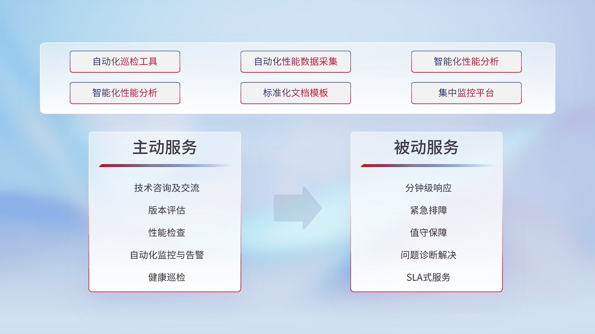 智能化工具和标准化文档,,,保障服务质量,,,提供主动服务(包含技术咨询、、版本评估、、、性能检查、、、自动化监控与告警、、、健康巡检)和被动服务包含(分钟级响应、、、紧急排障、、值守保障、、、、问题诊断解决、、、SLA服务)。。。